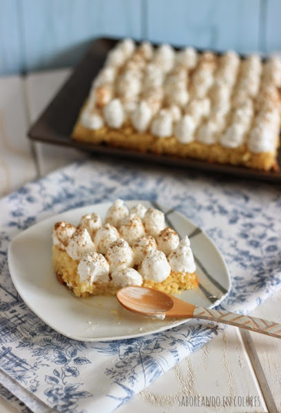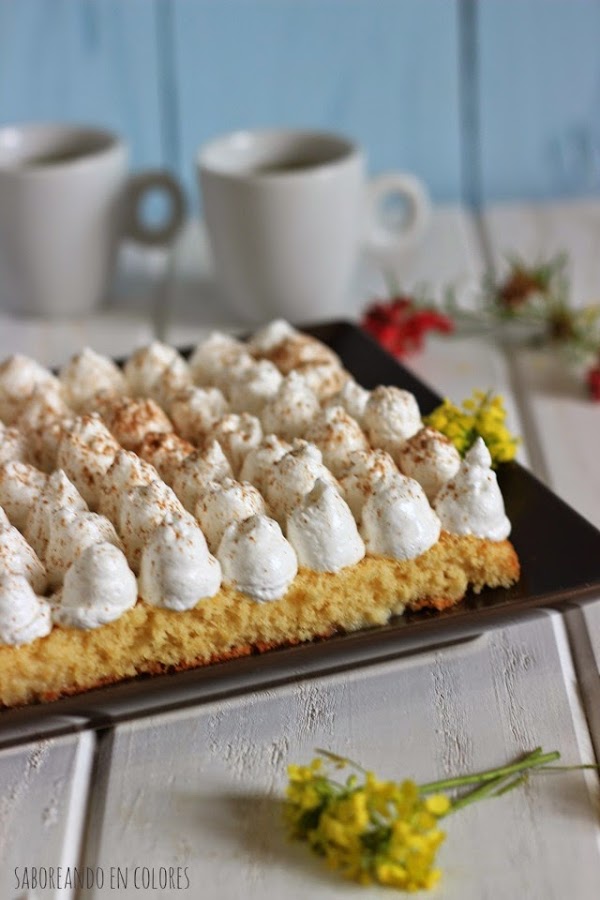 ? La preparación da para un molde redondo de 25 cm de diámetro, y saldría un bizcocho alto, pero como yo lo quería delgado, utilicé un molde rectangular de unos 30x20 cm. Sin embargo, la crema y el merengue, alcanza para la mitad de este bizcocho en la versión rectangular.