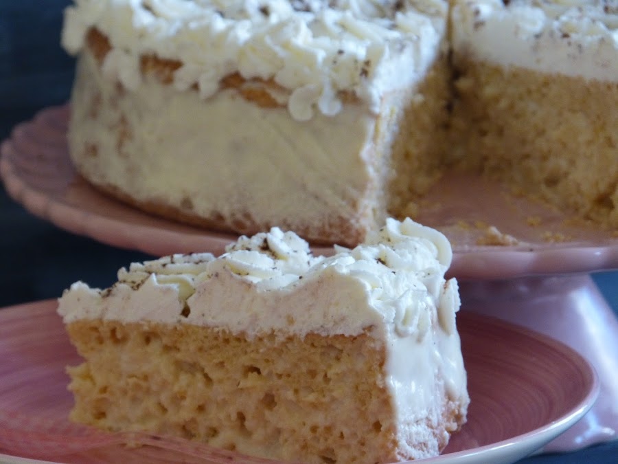Engrasamos un molde de 23 cm con mantequilla o con spray desmoldante. Vertemos la masa de nuestro bizcocho e introducimos en el horno, precalentado a 180 °C, con calor arriba y abajo, durante unos 45 minutos. Cuando esté hecho lo sacamos del molde y lo dejamos enfriar completamente.