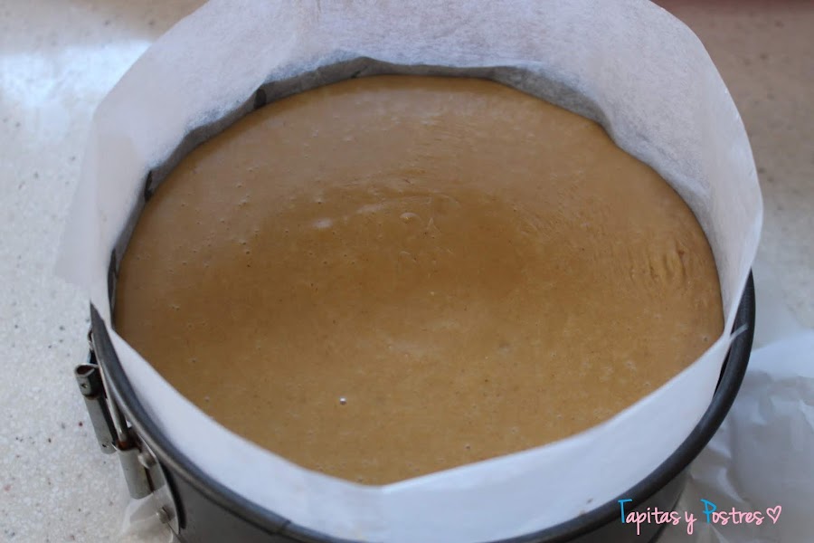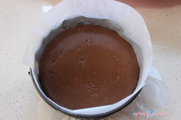 Al acabar, vertemos la mezcla sobre la capa de chocolate, pero comprobamos antes que está cuajada. Podemos hacer unas muescas con un tenedor para que las capas se "agarren". Dejamos reposar de nuevo otros diez minutos.
