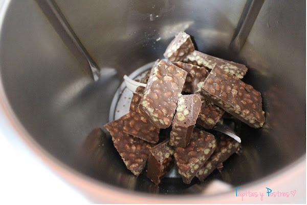 La primera capa es con turrón de chocolate crujiente. Lo trituramos.