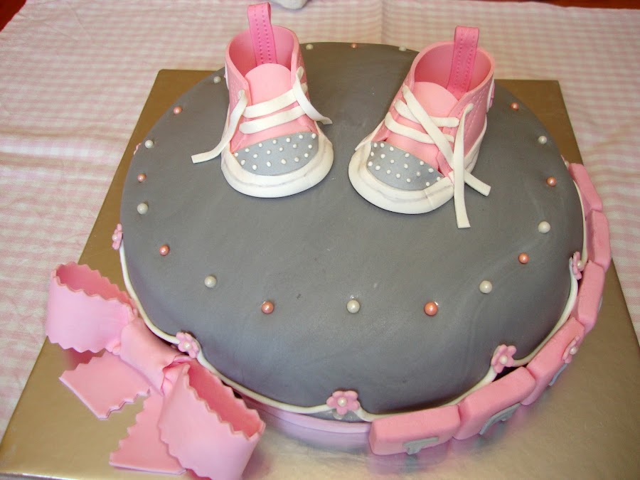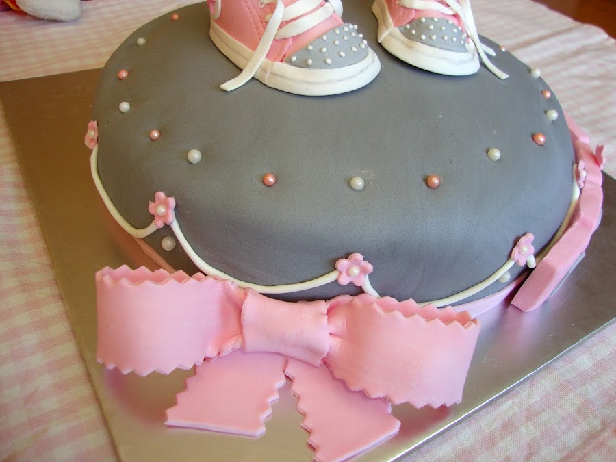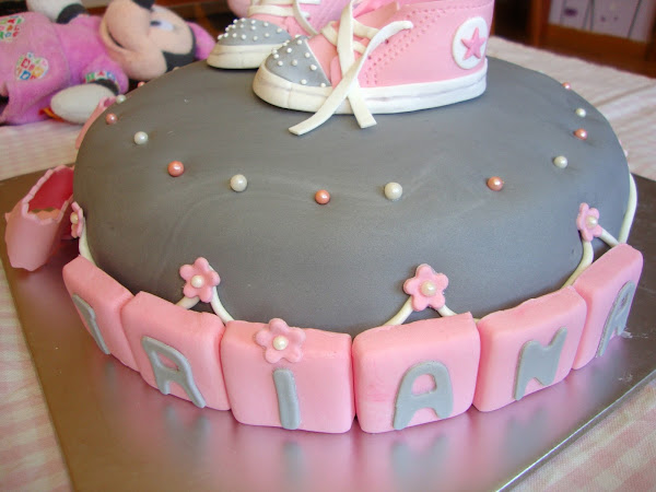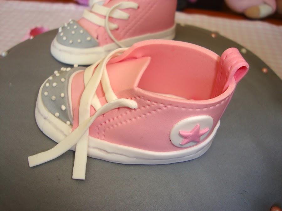 En la parte superior tiene unos zapatitos que son una imitación a unas zapatillas Converse.