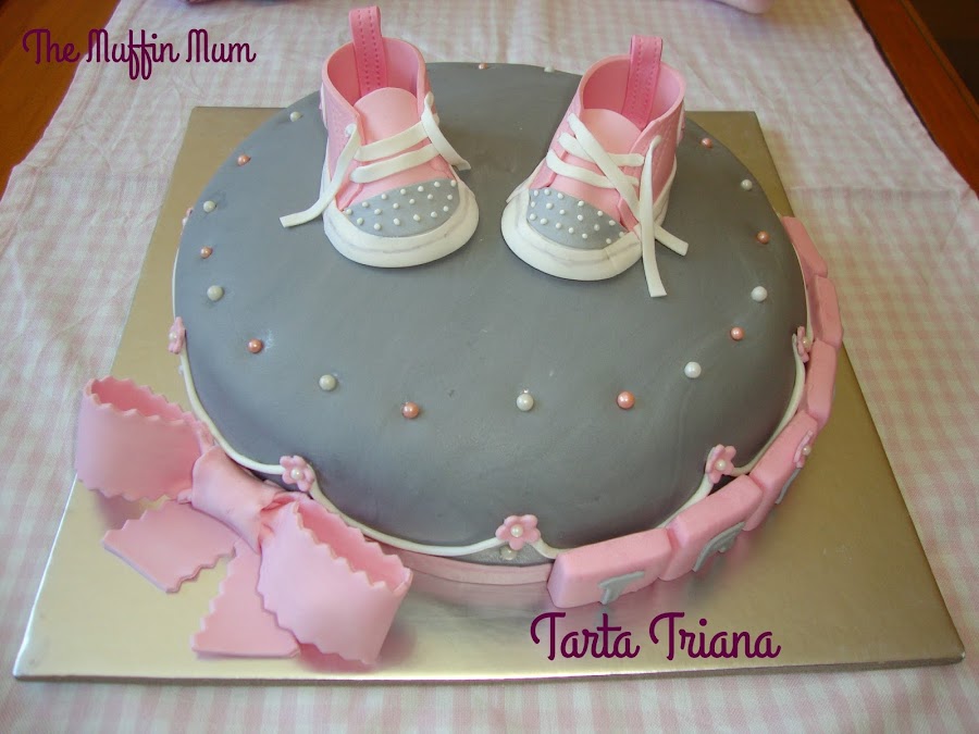 La decoración está realizada con fondant de colores y perlas de azúcar. Tiene un lazo y el nombre de Triana en los laterales.