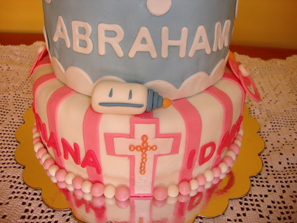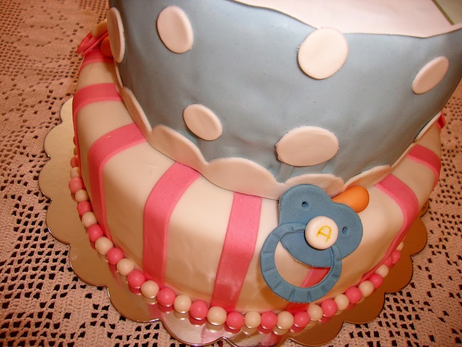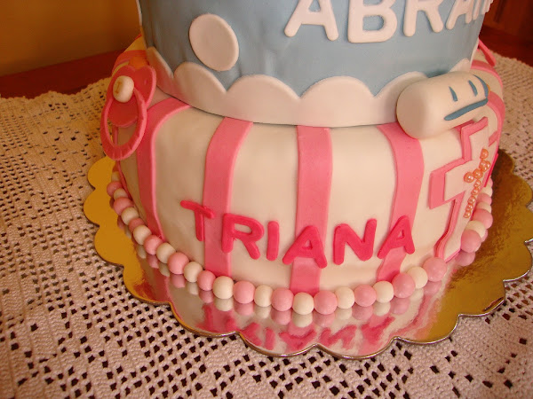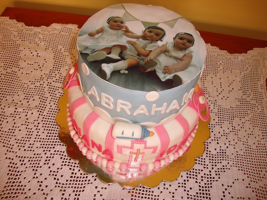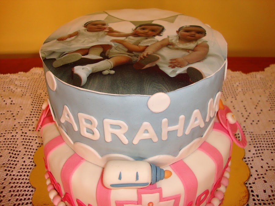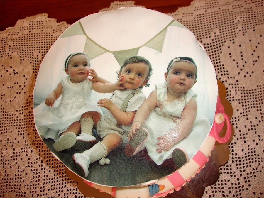 La decoración está realizada con fondant de colores y coronando la tarta hay una foto de los tres bebés realizada en papel comestible.