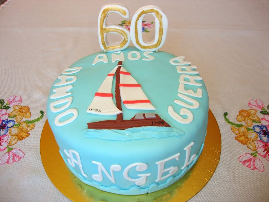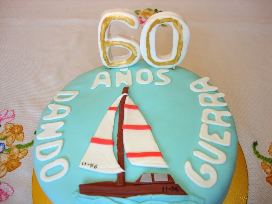 Esta era una tarta sorpresa de unos hijos a su padre, no sabían muy bien que motivo poner en el centro de la tarta pero lo que tenían clarísimo es que había que poner la frase "60 años dando guerra" y este es el resultado.