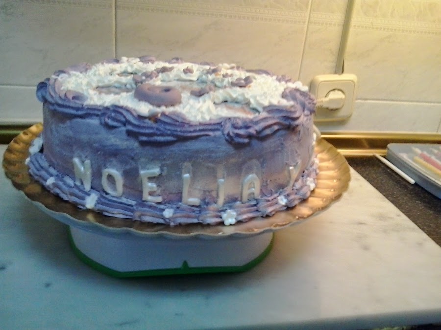 El bizcocho era de chocolate y el relleno de nata (crema de leche) con sabor a violetas. Se trata de una pasta nueva en repostería que da un sabor muy particular a bizcochos y a cremas. Y pensé que para la ocasión me iba a venir de maravilla.