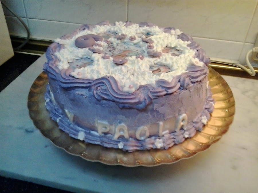 Como la tarta era de nata (crema de leche) color lila, la pasta de violetas le daba un toque muy particular, fino y suave. El contraste con el bizcocho de chocolate, era buenísimo.