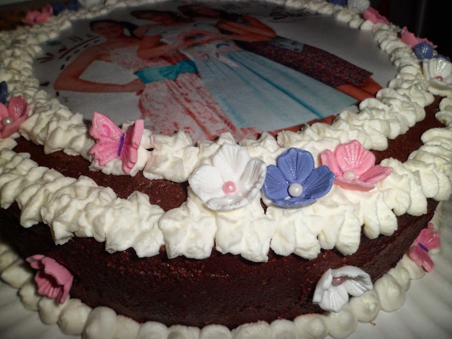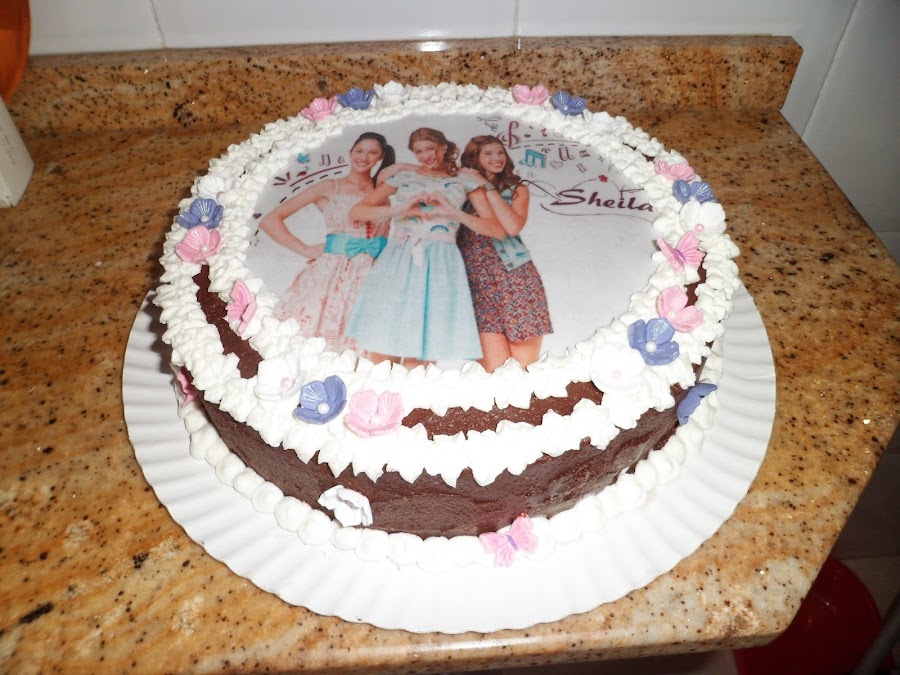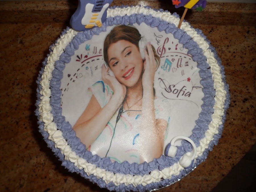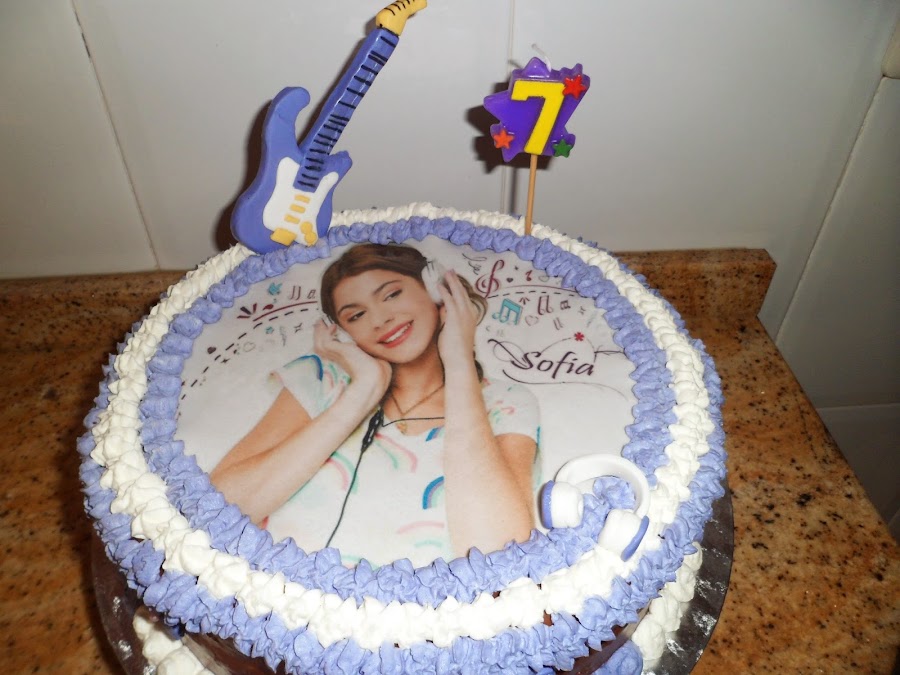 La segunda tarta vino por un cúmulo de sucesos... sólo a mi se me ocurre preguntarle a mi sobrina de que quería la tarta este año (si soy la tita guay!). Pues bien yo de buena fe esperando que me pidiese una Monster High, pues bien resulta que eso esta muy pasado de moda (sigo sin entender las modas de ahora.... a mi toda mi infancia me gustó Chicho Terremoto!) y que ahora lo que más le gustaba eran los personajes de Violetta (se pasó toda la tarde hablándome de un tal León, de Franchesca, Violetta y todos sus amigos...), total, que después de horas y horas, de verme todas las fotos del mundo que existen de esta serie ¡Por fin! dimos con la que ella quería. Pero esto no se quedó ahí ni mucho menos, después de llevar con las negociaciones desde enero, me viene el reto más complicado, y es que le han detectado una serie de alergias y no puede comer casi nada de lo que habíamos hablado...total que me veo con una tarta de Violetta en la que una niña de 7 años quiere mezclar chocolate y crema de limón.