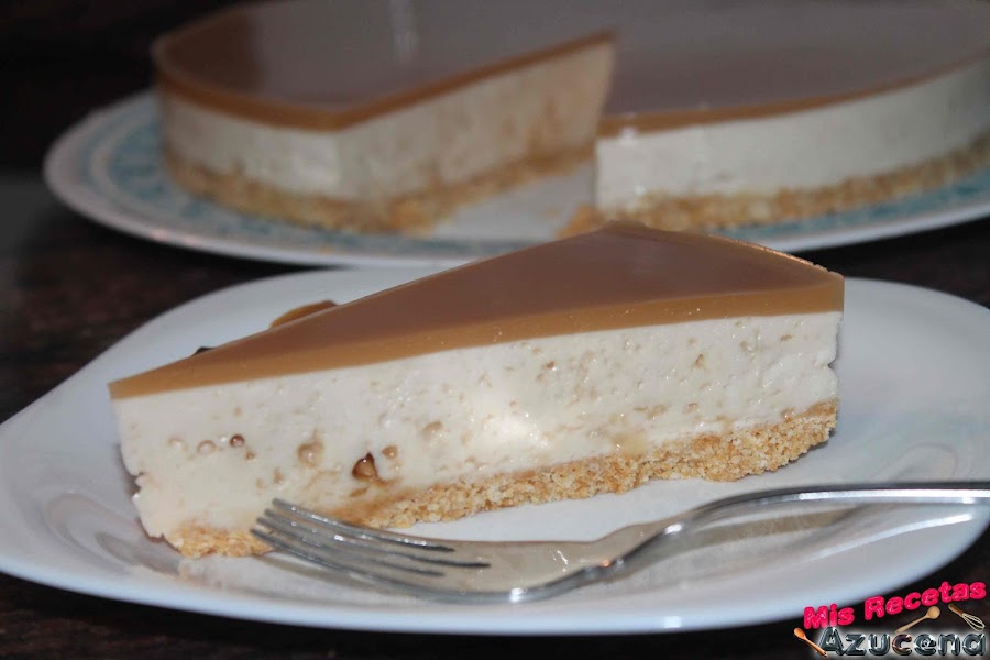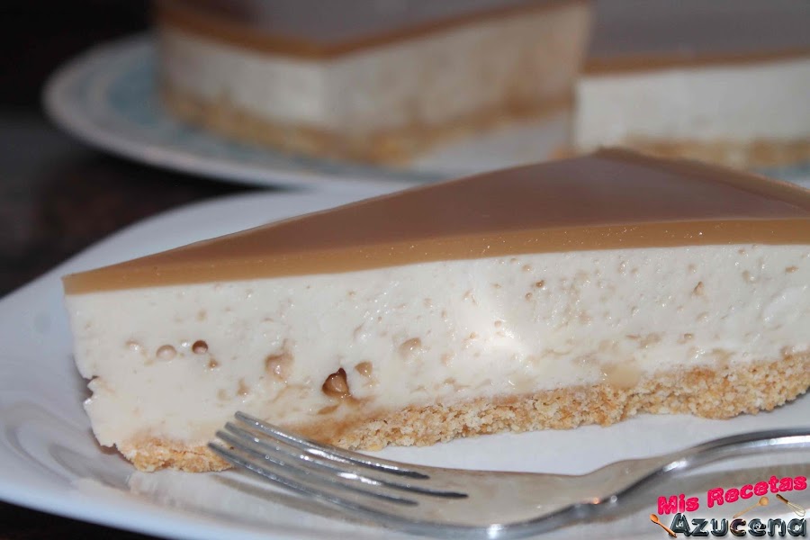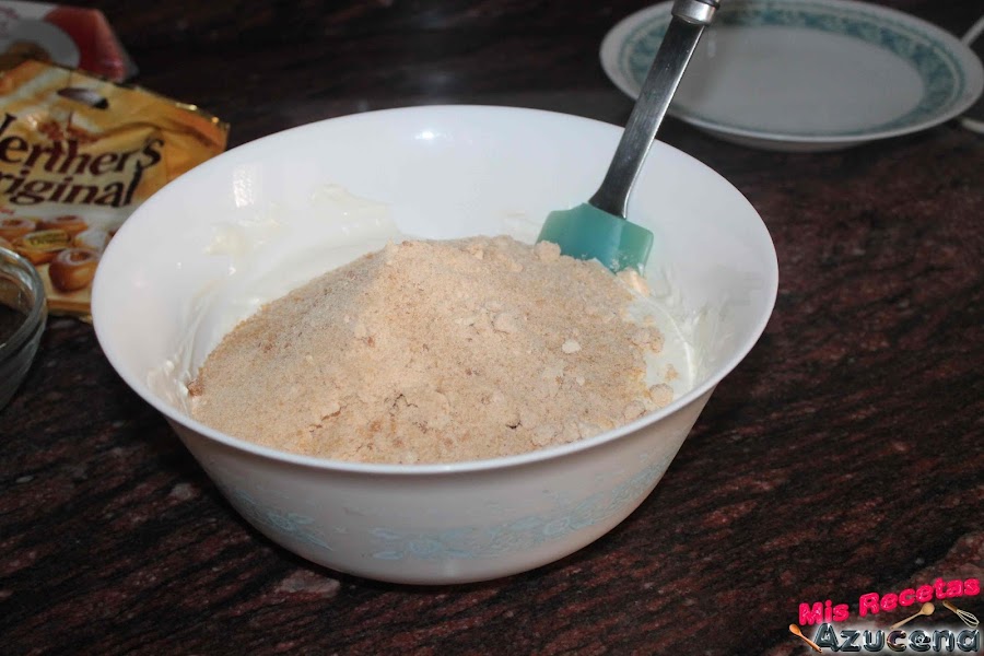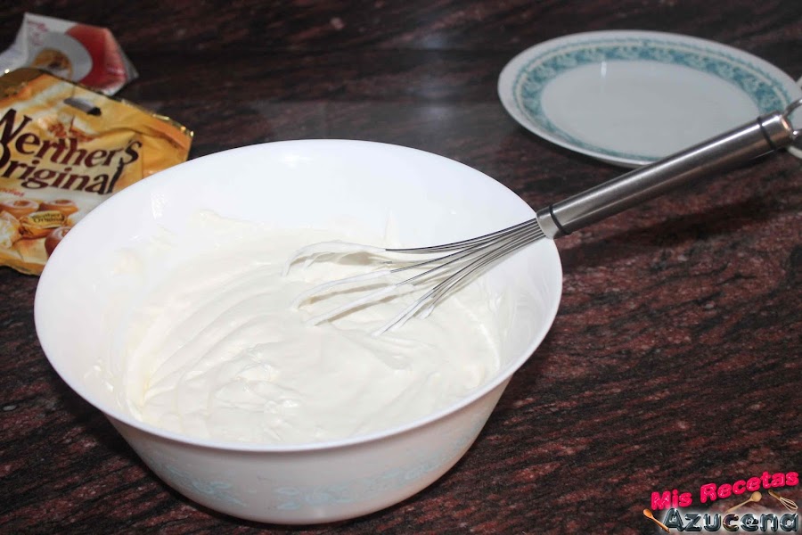 Después en otro bol añadiremos la nata (crema de leche) y con unas varillas empezaremos a montarlas hasta que quede una crema espesa, seguidamente añadiremos el queso y el yogur, mezclamos todo bien para añadir el caramelo picado.