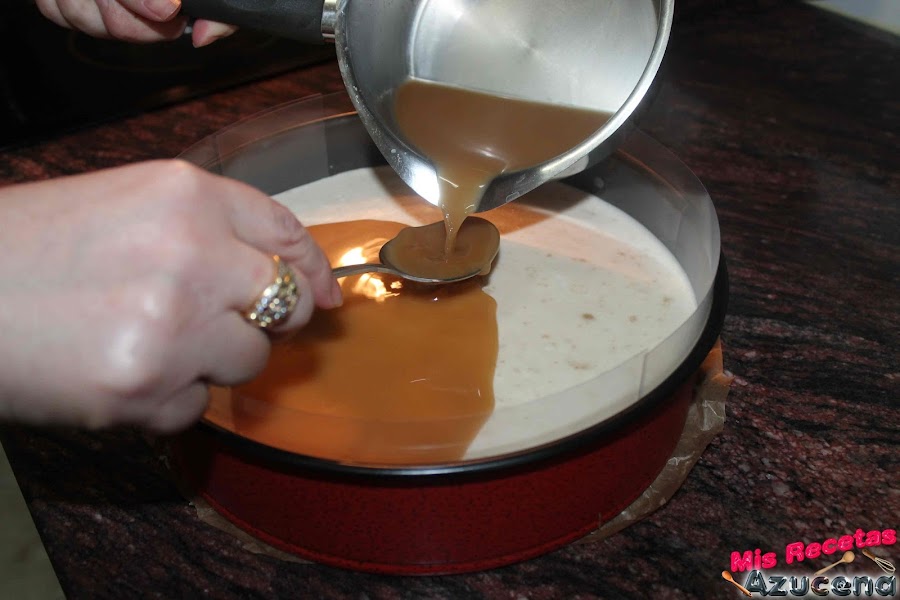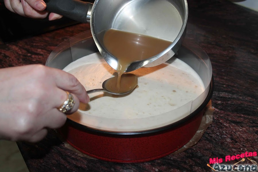 Sacamos la tarta de la nevera y con ayuda de una cuchara para que el líquido no caiga directamente sobre la tarta iremos repartiendo el contenido del cazo por toda la tarta hasta crear una capa, volvemos a meter en la nevera y dejaremos que endurezca bien.