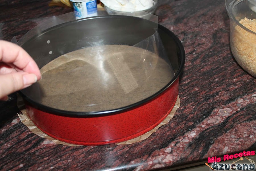 Cogemos un molde de 26cm de diámetro y le ponemos papel vegetal en la base, por los lados del molde pondremos una tira de acetato para luego poder desmoldar bien la tarta.