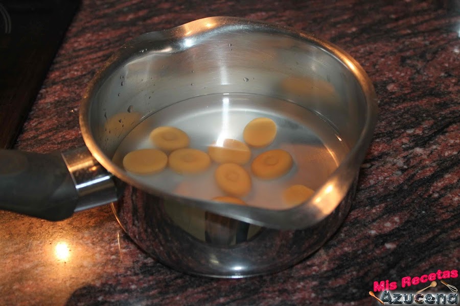 Ponemos un cazo al fuego, a fuego medio con el agua y los caramelos, lo dejaremos hasta que los caramelos se disuelvan en el agua.