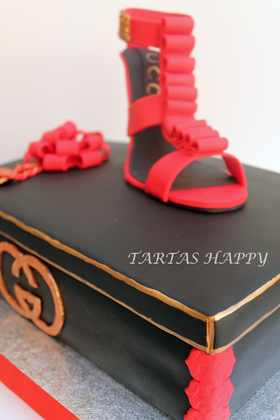 A Mayca le encantan los zapatos,bueno los zapatos y todo lo que está relacionado con las compras y con las marcas y a ella la quisieron sorprender con una tarta con un zapato de GUCCI modelado.