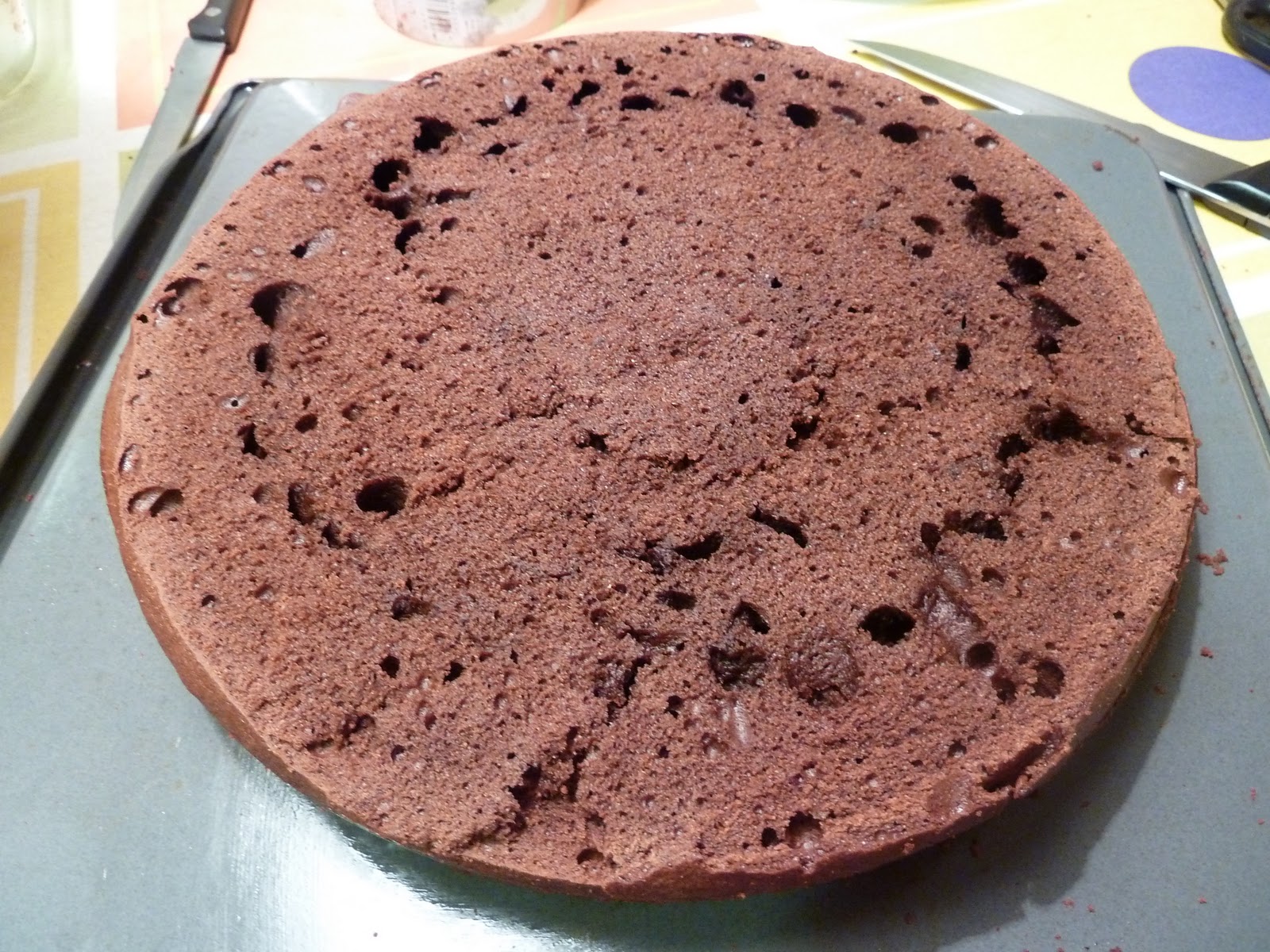 Yo he utilizado una base cuadrada de poliespán (corcho sintético blanco) comprada en el Leroy Merlín. La he forrado de papel aluminio, luego he puesto papel cebolla de color y después he vuelto a forrar con papel celofán, para impermeabilizar. 6) Calar bien con el almíbar la parte de abajo de cada bizocho utilizando una brocha, por ejemplo. 7) Poner el relleno de nata (crema de leche) y trufa, uno en cada bizcocho.