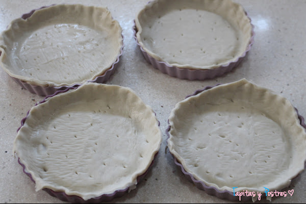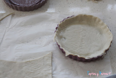 Extendemos la lámina de hojaldre y recortamos círculos del tamaño de los moldes de tartaleta. Si no tenéis moldes, recortáis un circulo y un aro. De esta manera ponemos el aro de hojaldre sobre el círculo y al hornearse subirá creando una pared.