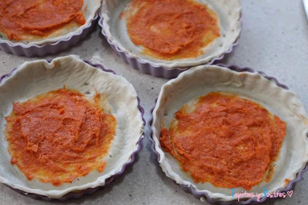 Ponemos un fondo de sobrasada en cada tartaleta.