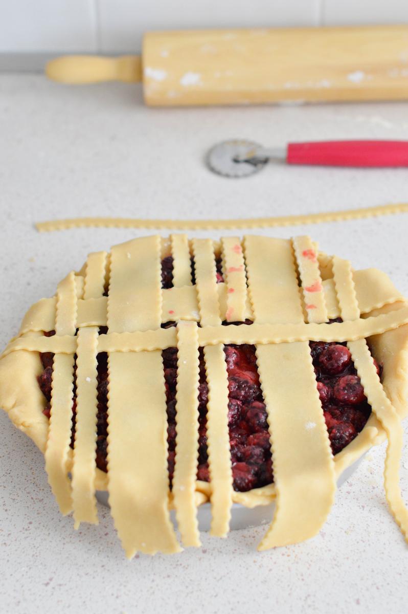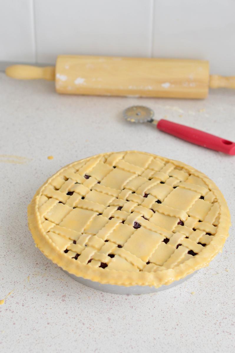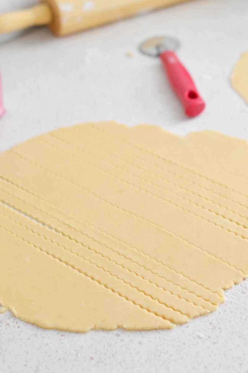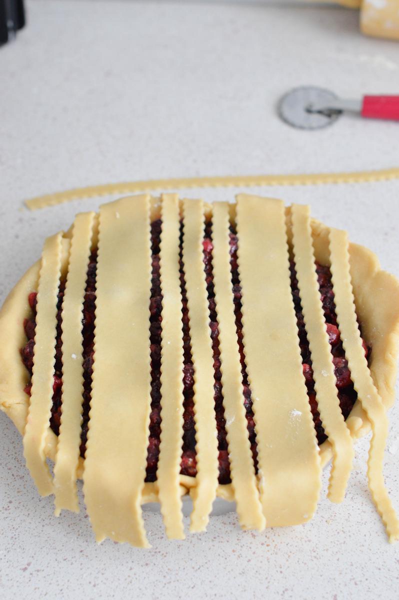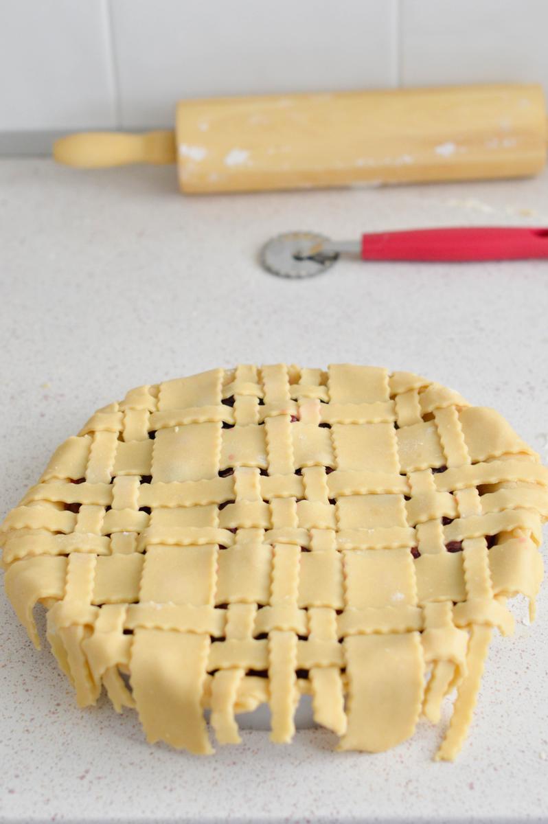 Según las vayamos poniendo vamos enderezando bien todas las tiras para que queden lo más derechitas posibles. Cuando tengamos el enrejado listo cortamos el sobrante y presionamos los bordes para sellar bien nuestra tarlaleta maravillosa.