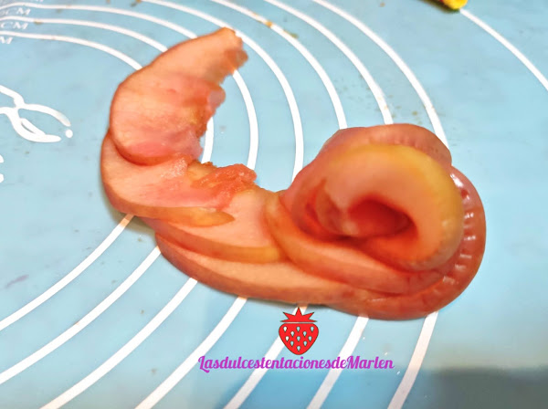 Forma fila con las láminas de manzana de 10 en 10, ligeramente superpuestas y enróllalas con cuidado que mantenga la forma de la flor.