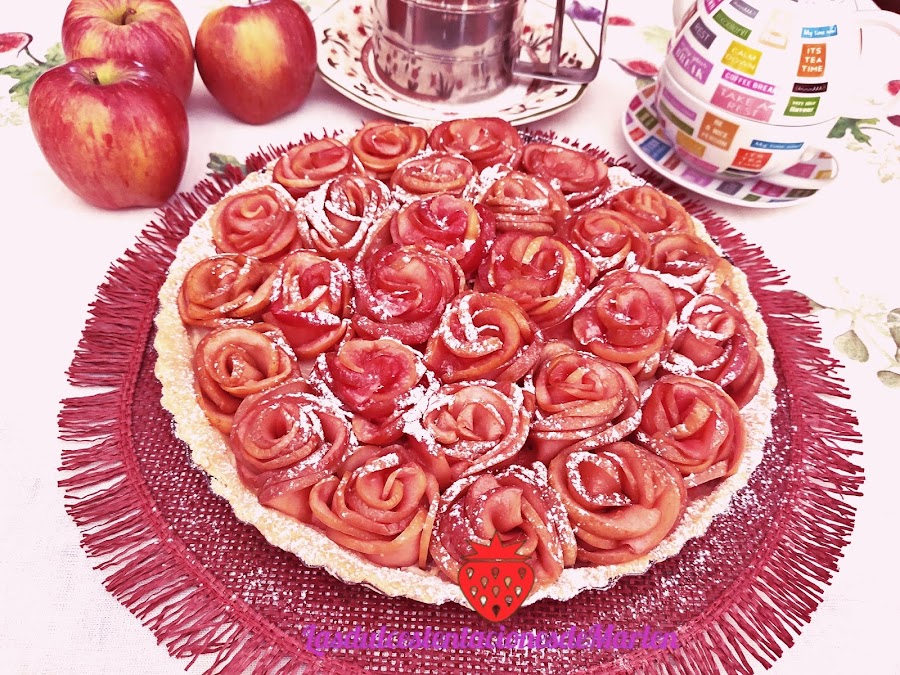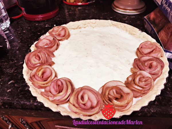Desmolda la tarta y dispón las rosas sobre la crema pastelera.