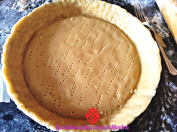 Con el molde untado con mantequilla, fórralo con la masa. Pínchala y retira la sobrante.