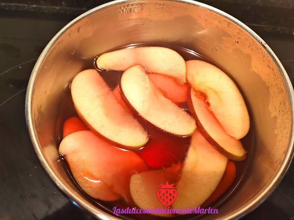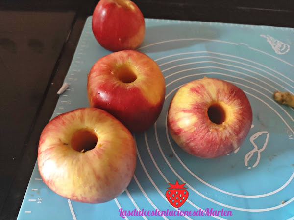 Lleva a ebullición 1 litro de agua con el azúcar. Retira del fuego, añade 1 o 2 gotas de colorante, si lo deseas y mezcla. Lavas las manzanas, sécalas y descorazónalas.