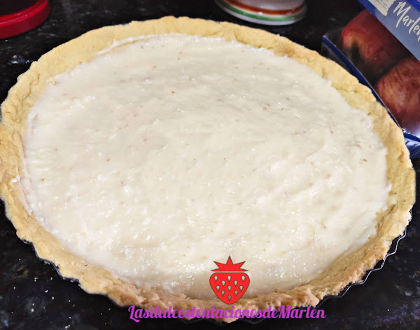 Cumbre la crema con film, que toque la superficie de la crema y deja templar. Viértela en la base de la tarta, alisa la superficie y reserva en el frigo.