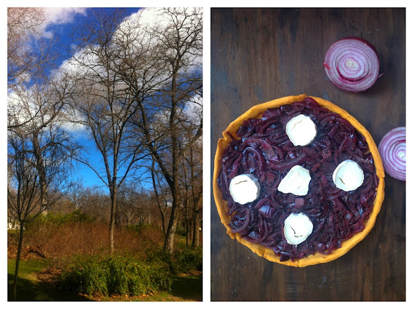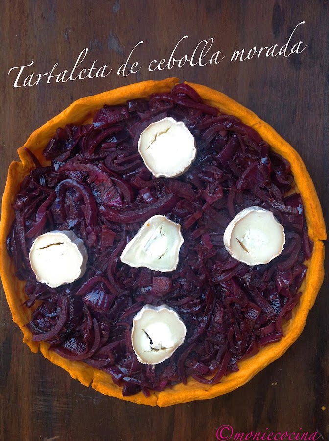 Sacamos la tartaleta y rellenamos con la cebolla. Yo le añadí unos trocitos de queso de cabra que daban sabor y color estupendo.