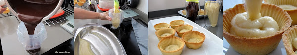 Preparar los ingredientes, colocar las tartaletas en una bandeja y la crema pastelera y la ganaché de chocolate en mangas pasteleras, esta última con una boquilla de estrella.