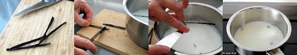 Abrir por la mitad, a lo largo, la vaina de vainilla y rascar las semillas con la punta del cuchillo. Añadir a la leche semillas y vaina y llevar a ebullición.