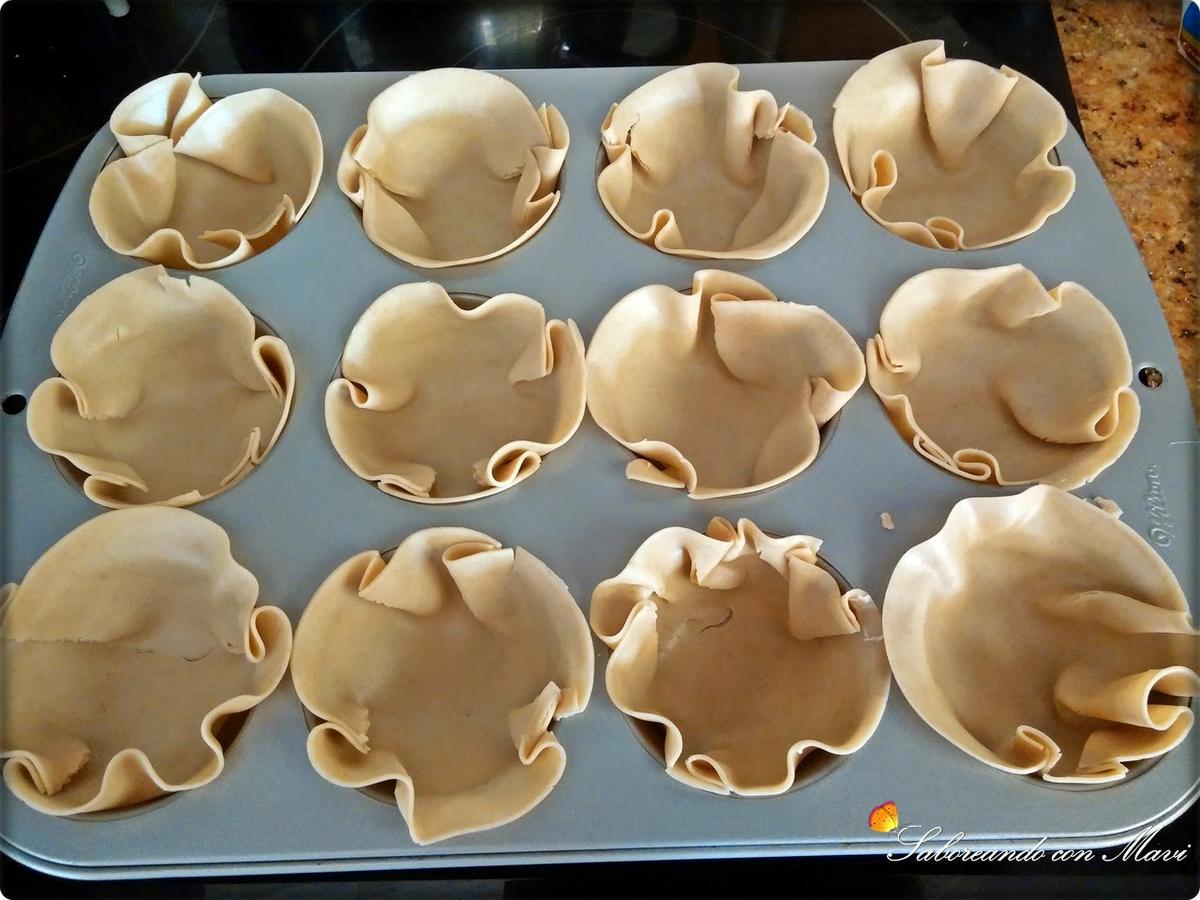 Engrasamos el molde y forramos los huecos con las obleas.