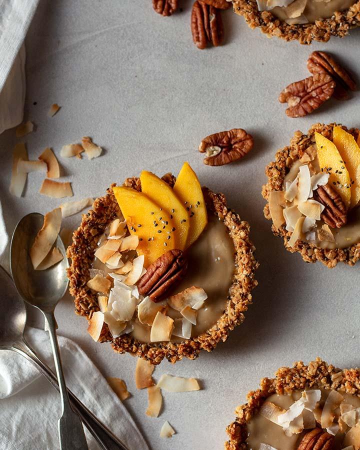 Para montar las tartaletas rellena cada una con un poco de crema de coco y encima coloca unas rodajas de mango, una nuez pecana, un poco de coco deshidratado y unas semillas de chía. ¡Quedan ricas y preciosas! Aguantan unos 4 días en el frigorífico.