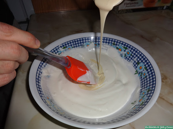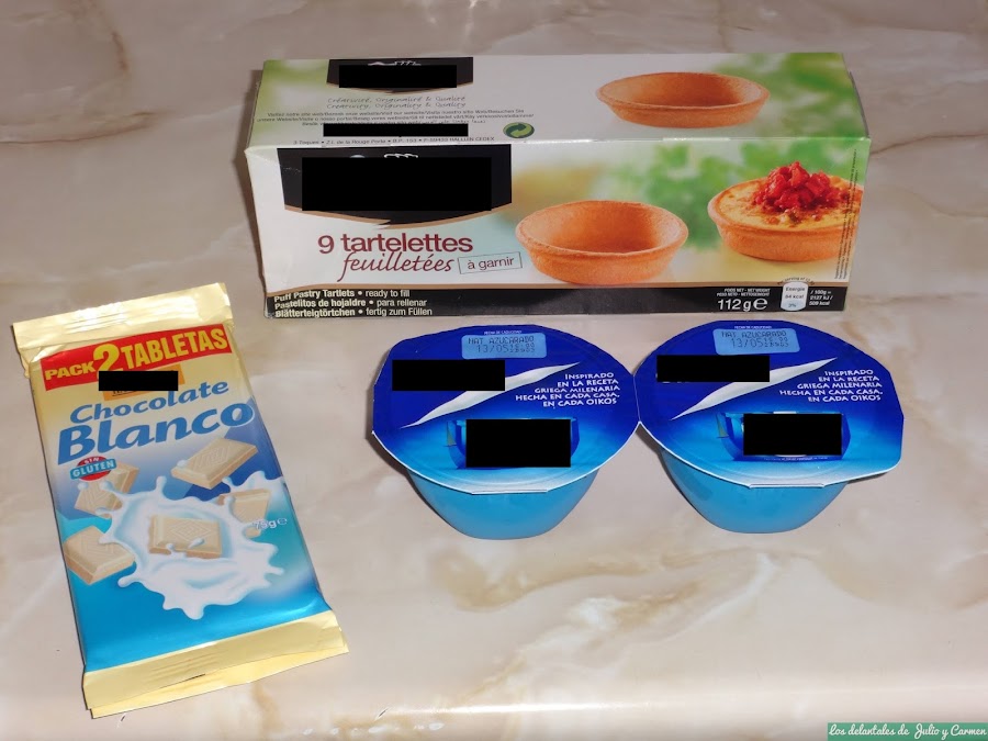 La parte fundamental de este dulce es la mousse que prepararemos con los yogures y el chocolate blanco. Nos quedará una crema ligera a la vez que sabrosa, la cual, ademas de poder usarla como nosotros os indicamos, rellenando unas tartaletas (el realizarlo así es mas bien por el plano estético), o bien podemos tomarla directamente, o en copas adornándolo como mas nos guste... Las opciones son muchas, y ya entra en juego nuestra imaginación.