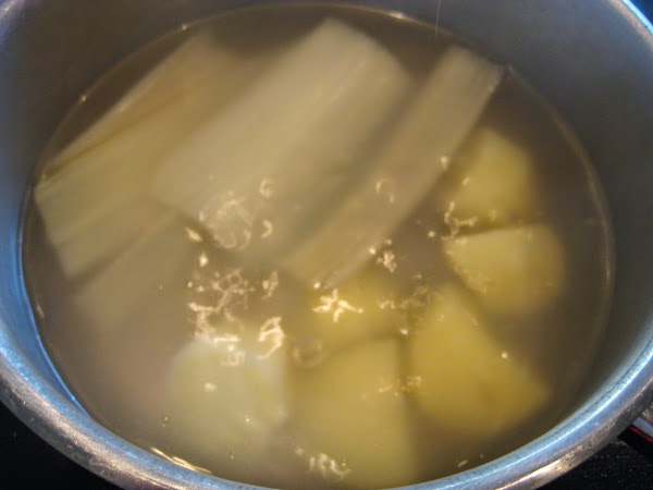 Poner en un cazo abundante agua y una pizca de sal incorporar las patatas y las pencas. Que cueza a fuego lento unos 25 minutos. Una vez listo escurrir bien, reservar en boles.