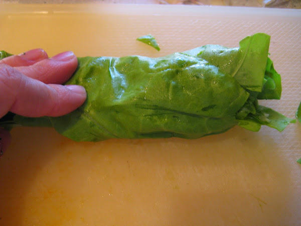Limpiar las acelgas separando el verde de lo blanco, lavar bien y hacer un rollo y cortar en juliana. La parte blanca la penca sacarle la pielecilla por ambos lados.