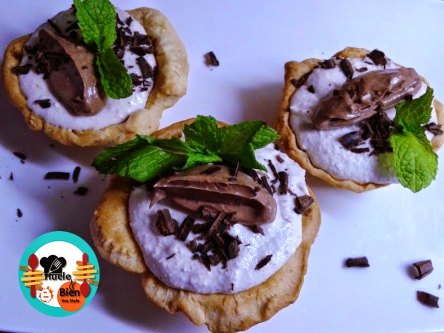 5.- Derretimos el chocolate con el resto de la otra nata (crema de leche), (reservamos un poco para rallar). Dejamos enfriar un poco y mezclamos la nata (crema de leche) con el chocolate con movimientos envolventes. Ponemos una cuchara de mousse de chocolate en cada tartaleta y esparcimos un poco de chocolate rallado sobre ellas. Decoramos con una ramita de hierbabuena.