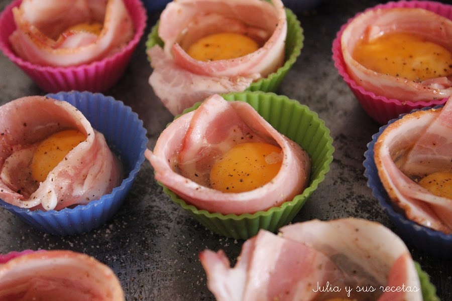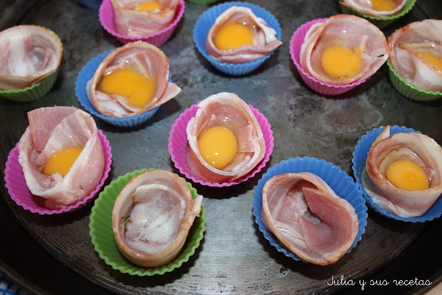 Partimos las lonchas de bacon por la mitad. Colocamos un trozo alrededor del molde de magdalena, echamos un huevo de codorniz dentro.