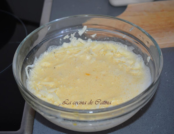 En un bol, batimos los huevos, los mezclamos con el queso rallado, la nata (crema de leche) y el sofrito de cebolla, bacon y dátiles que tenemos reservado.