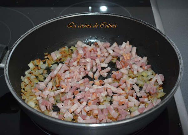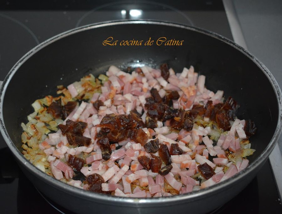 Añadimos el bacon cortado en trocitos y los dátiles picados en trozos pequeños. Cuando este frito apartamos del fuego y reservamos.
