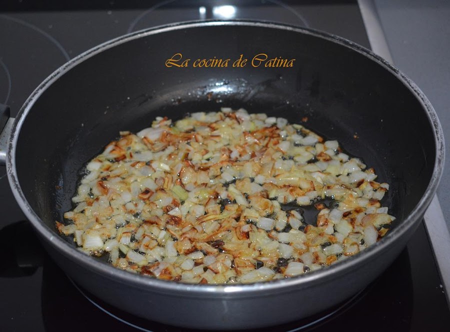 Para el relleno, ponemos a calentar la mantequilla a fuego lento y rehogamos en ella las cebollas picadas hasta que las veamos doradas.