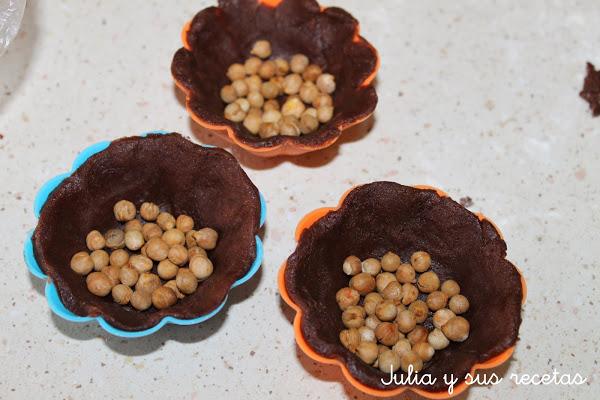 Untamos con aceite los moldes y los forramos con la masa. Les ponemos garbanzos cubriendo el fondo para que no suba y las horneamos 15-20 minutos con el horno precalentado a 180º.