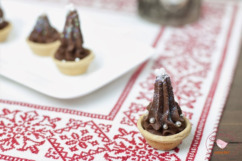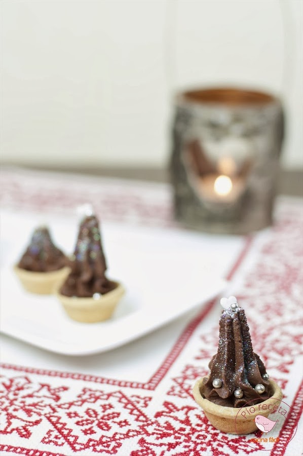 Ya estamos rodeados de bloas,luces,arbolitos...ya casi es Navidad y hay que ir pensando en los menus de estos días tan señalados.Hoy os traigo unas tartaletas muy facilitas que os pueden servir para rematar una buena comida/cena.Yo las he hecho con chocolate negro pero podeis cambiarlo por chocolate con leche o chocolate blanco,o hacer una variado de los tres para tener contentos a todos los comensales.La decoración es opcional,y cada uno puede usar las cosillas que tenga por casa como almendras,bolitas de colores,figuritas de azucar...lo que querais o incluso con un poco de azucar glas quedarían estupendos.