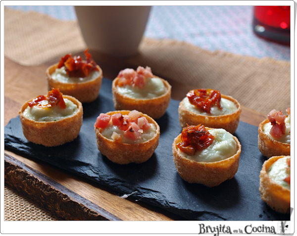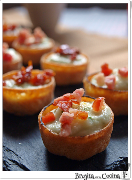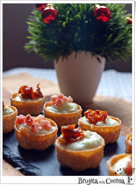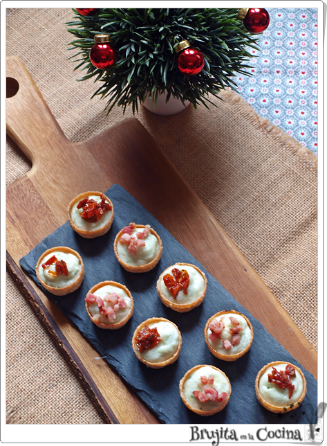 Para montar las tartaletas, rellenamos con la crema y después ponemos bacon crujiente o tomate en cada una de ellas. De esta forma hay una opción vegetariana bien rica.