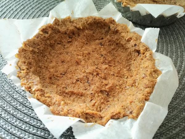 En un molde para tarta ir amoldando la masa de dátiles con los dedos (yo usé papel mantequilla, de horno o vegetal para que no se pegara, pero si dispones de moldes de silicona esto no es necesario). Una vez hecho este paso guardar en la nevera o refrigerador.
