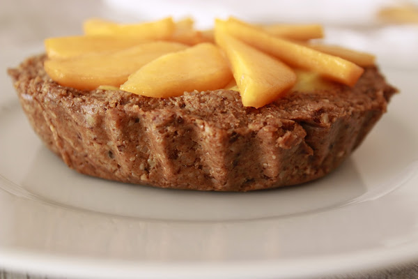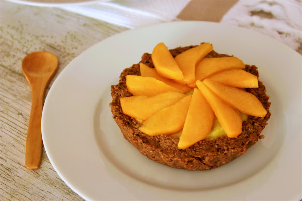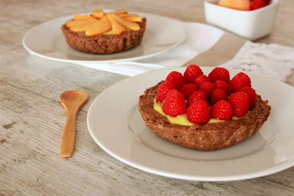 Sacar de la nevera los moldes de tarta con la base, rellenar con la crema de vainilla y plátano, y por último, poner la fruta que más te guste, en mi caso usé frambuesas y melocotón amarillo (durazno amarillo o durazno conservero).
