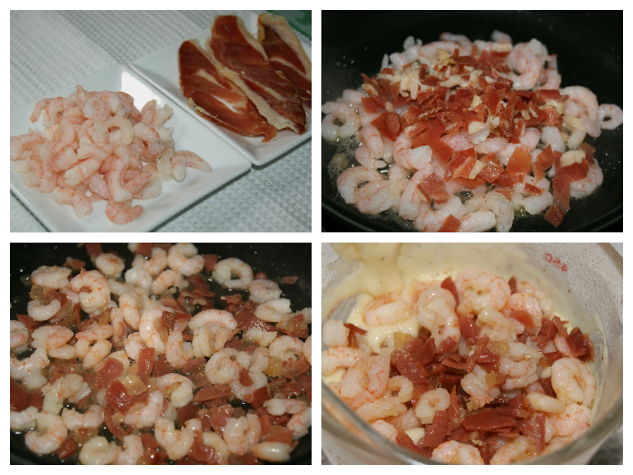 Cortamos el jamón bien pequeño y lo salteamos junto con las gambas durante un par de minutos aproximadamente.Lo añadimos a la bechamel y lo mezclamos todo.