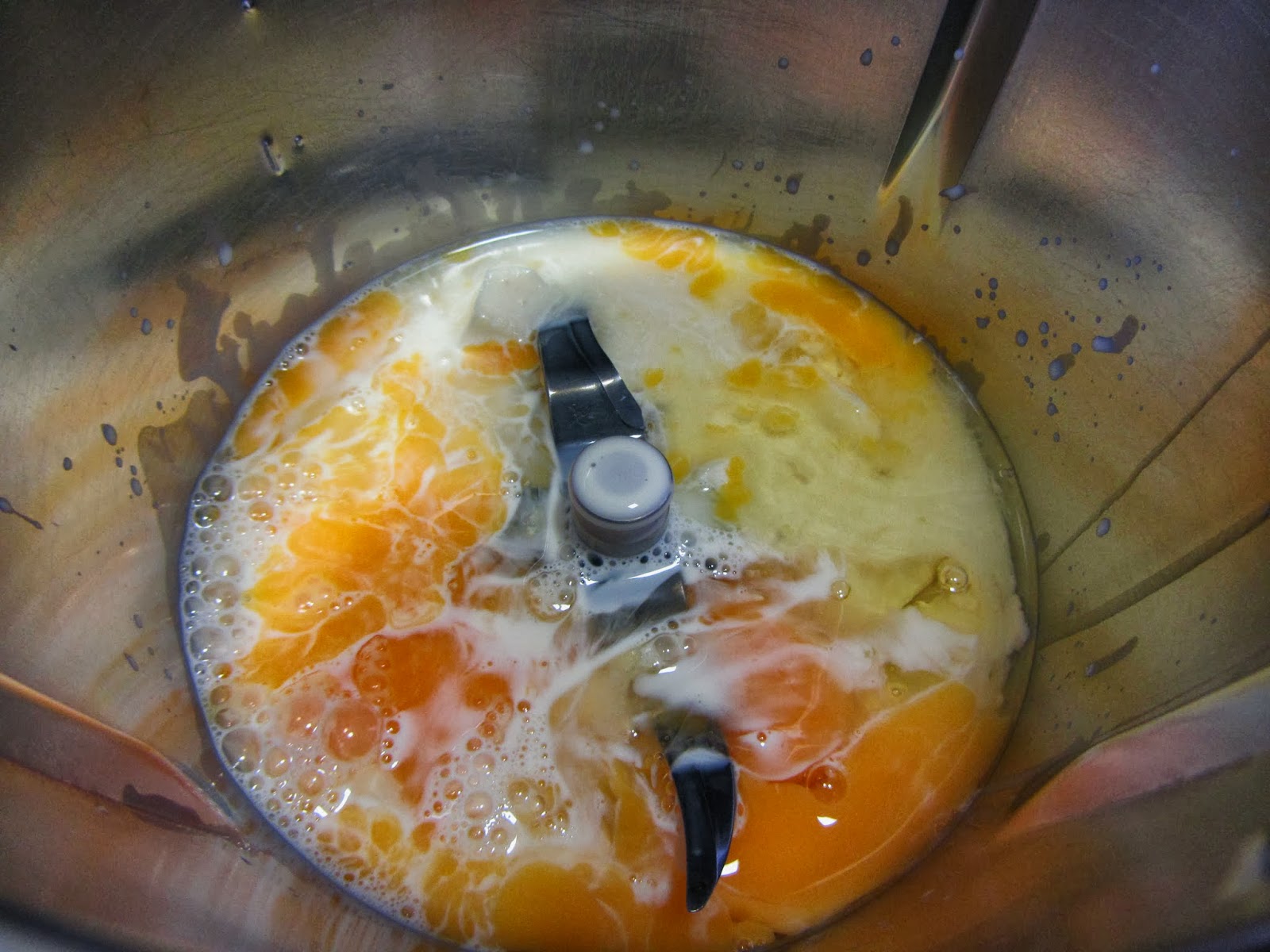 Batimos los huevos, la leche, la sal, el queso (troceado, para que se mezcle más fácilmente) y la pimienta (En Thermomix, programaremos 30 segundos a velocidad 5-6).