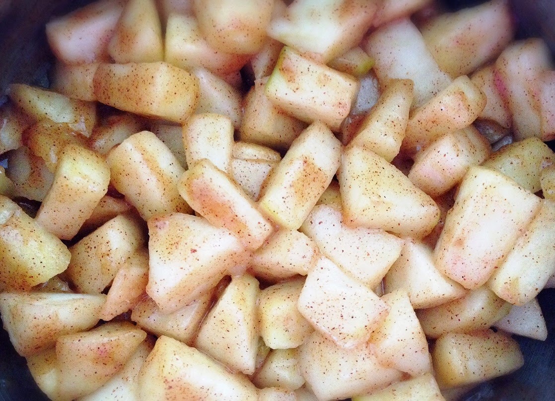 6. Pelar las manzanas y cortarlas en cuadros pequeños. Poner en una olla junto con 2 cucharadas de azúcar, la canela, la harina y la mantequilla. Cocinar a fuego medio por 15 minutos aproximadamente o hasta que la manzana este ligeramente cocida. Dejar enfriar.