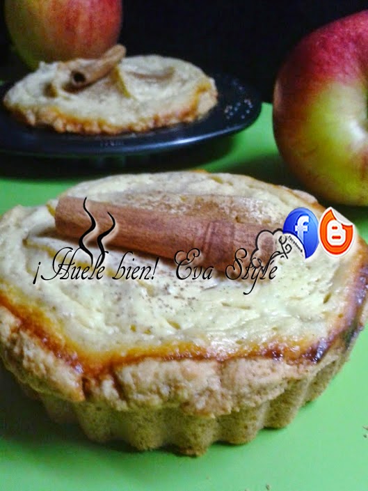 6.- Colocamos las mazanas sobre la masa quebrada, la cubrimos con la masa de queso. Precalentamos el horno a 180ºC. Cocinamos las tartaletas durante 40 minutos. Hasta que se cuaje el queso y este dorada por fuera. Dejamos enfríar y esparcimos por encima de cada una canela en polvo.