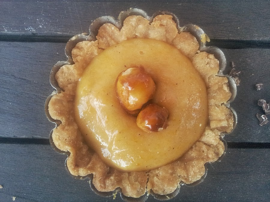 Cream of Pumpkin: We boil the cream, sugar, spices and lemon and orange peels. Few minutes away from the fire so that we cover all infusione. Strain and return to the heat, quietly, and without boiling add the two eggs, stirring constantly. Do not boil, because it cut. Add the pumpkin puree and the teaspoon of cornstarch. Stir until it begins to thicken see, remove from heat and keep moving so that the dough is very thin and homogeneous. Leave temper and put in the refrigerator .You can also make roasted pumpkin is really delicious, being careful with the spices we add later.From black chocolate ganache : We boil the cream, remove from heat and add the chocolate into very small pieces. Stir from the center to the outside of the pan until all the chocolate has melted. Add the butter also very cut and continue stirring so that our cream perfectly. Acquire brightness and consistency. You know I "m addicted to chocolate black, but really this ganache can be made with any type of coverage, even with white.Final assembly: For the base of the big pie I recommend you do not bring forth the pastry from the baking pan, I even buy some nice cakes to serve your in it, but you do need to be removed tarts are easier to handle. Fill to the brim with creams, even mix. They are delicious together or separately. Decorate with chocolate shavings, sugar thread ( in another post I will explain how to do), with nut nougat with candied orange peel and lemon.