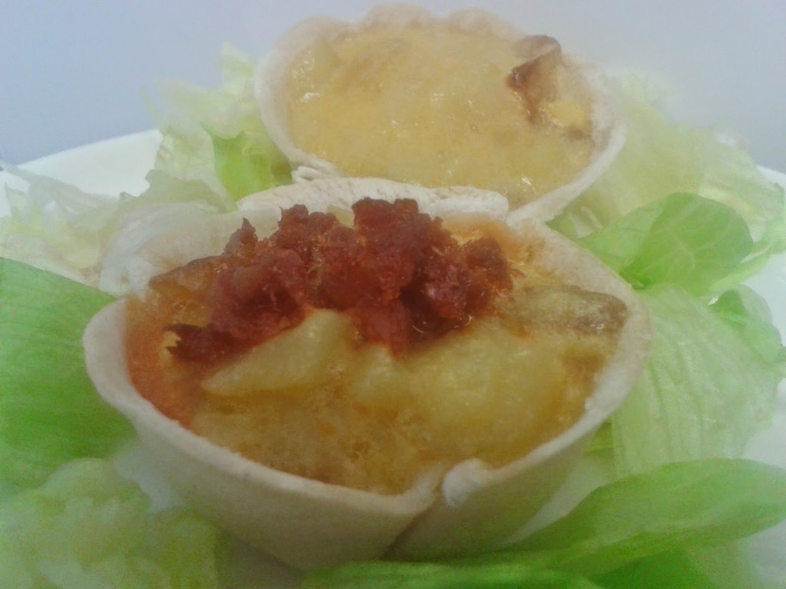 Aplastáis un poco con los dedos y vais adaptando a los moldes, si no tenéis uno rígido hacedlo en moldes dobles de magdalenas.. rellenáis con el preparado de tortilla y arriba le podéis poner chorizo, queso.. lo que mas os guste..