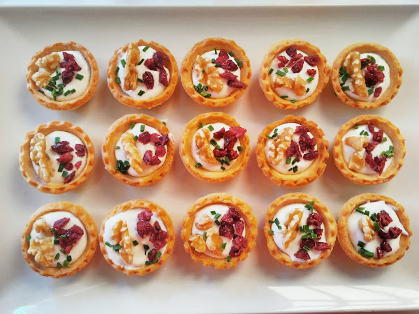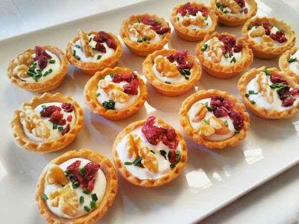 Con una cucharilla rellena cada una de las tartaletas y termina colocando los arándanos, las nueces y el cebollino troceados.